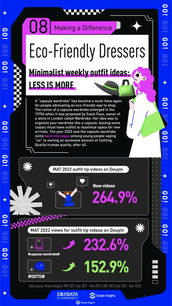 In 2022, the concept struck a cord again with Gen Z fashion circles in China as new video content in this subcategory grew 264.9%. The popular Douyin hashtags “capsule wardrobe” and “what to wear today?” also grew by 232.6% and 152.9%, respectively.