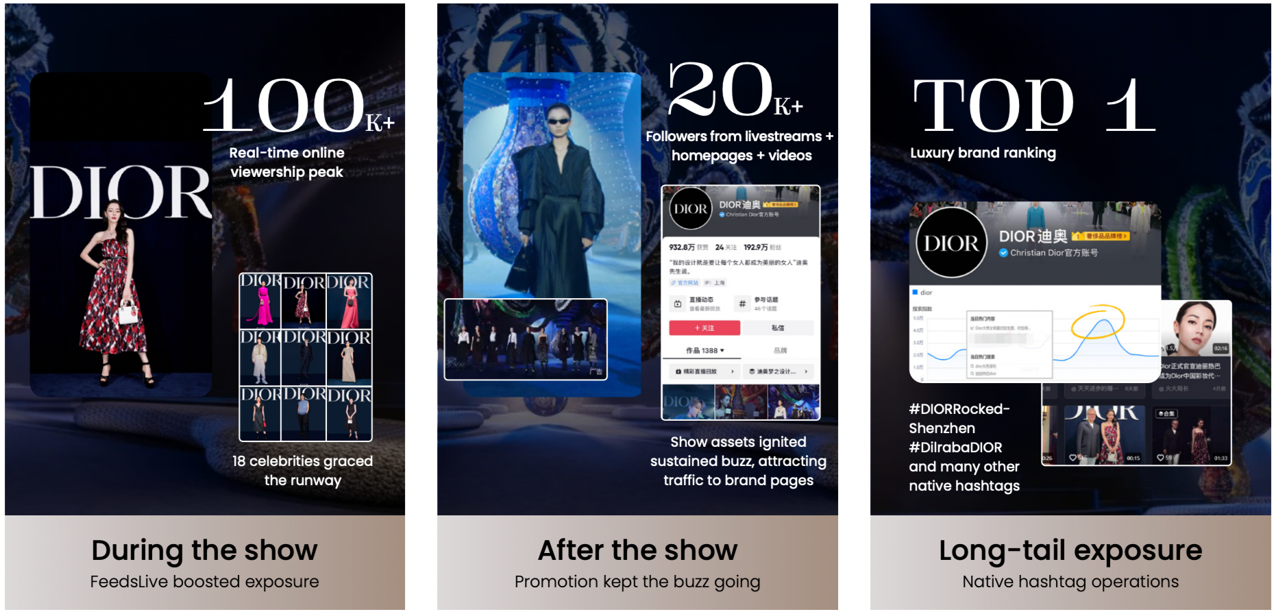 After the show, trending hashtags including #DIORRockedShenzhen and #DilrabaDIOR helped DIOR top the app as the number one luxury brand. DIOR also gained over 20,000 new followers from a combination of livestream, homepage, and video assets.