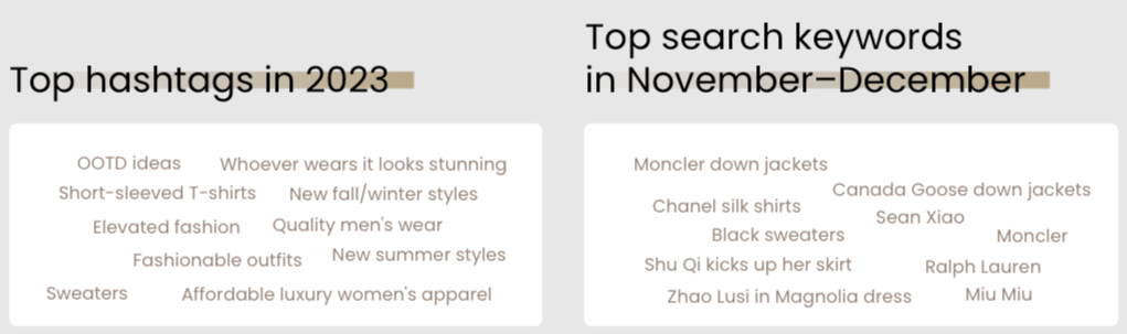 As a key barometer for desire, search activity experienced 56% YoY growth in 2023 with 150 million average monthly searches. Popular search keywords during the November and December period included Valentino, Liu Yifei, Sean Xiao, Miu Miu, Moncler down jackets, and Ralph Lauren.